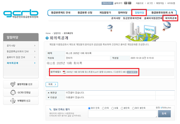 우리 위원회는 게임물 등급분류의 전문성과 공정성 확보를 위해, 위원회 회의 시 법적 의무사항인 회의록을 상세히 작성하고 있습니다. 이는 「게임산업진흥에 관한 법률」 제24조의3(등급분류기관의 준수사항) 제4항에 따라, 등급분류 및 등급 재분류 업무와 관련된 의사결정 내용을 기록·관리해야 하는 법적 의무에 근거합니다. * 세부 내용 가. 작성일자: | 2025년 11월 위원회부터 적용 | 나. 공개시기: | 작성일로부터 5개월 후 (기업의 정보 보호를 위한 조치) | 다. 공개메뉴: | 홈페이지 → 알림마당 → 회의록공개 메뉴 |
