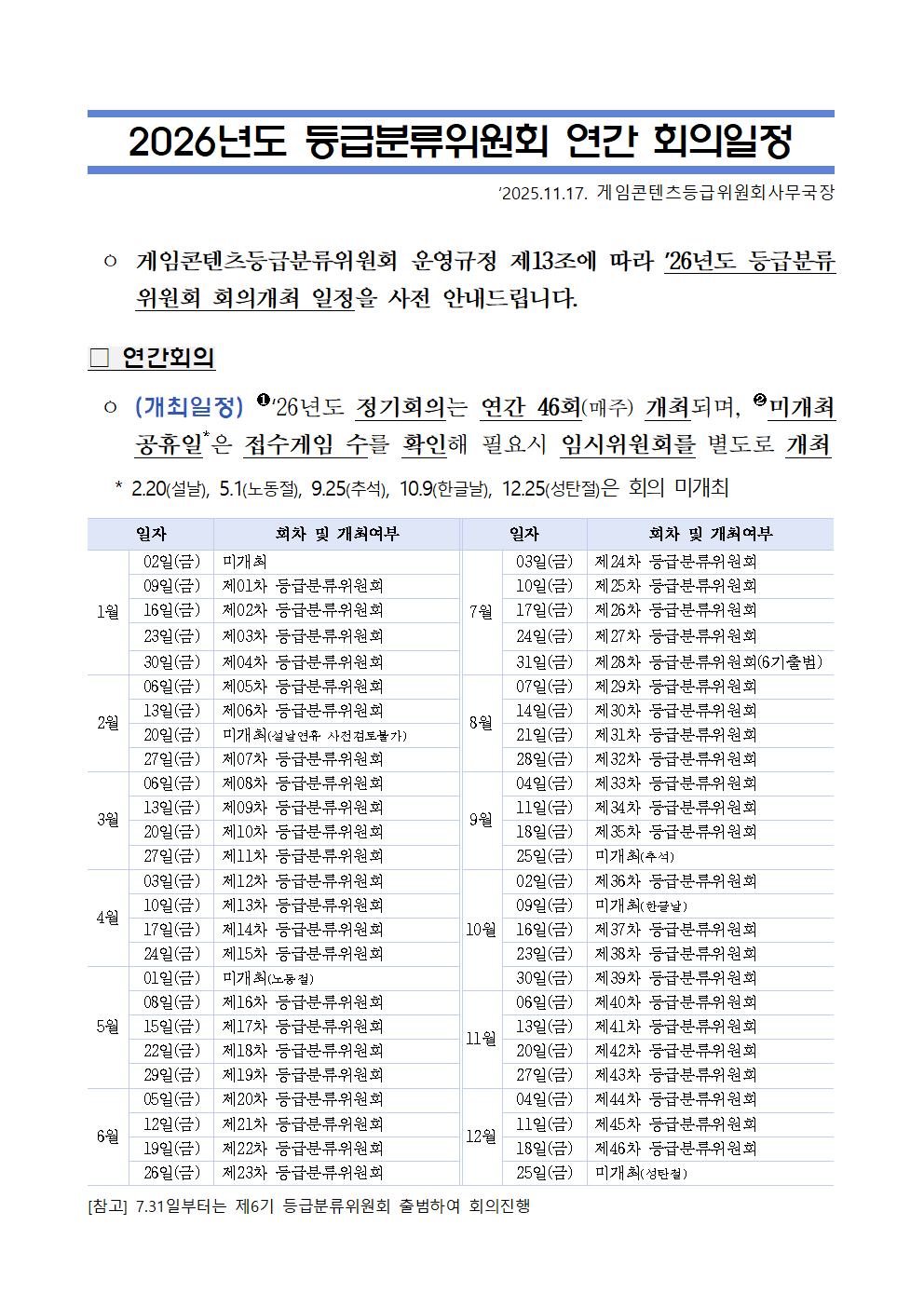[공지] 2026년도 등급분류위원회 연간 회의일정